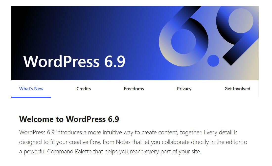 WordPress 6.9 introduces a more intuitive way to create content, together. Every detail is designed to fit your creative flow, from Notes that let you collaborate directly in the editor to a powerful Command Palette that helps you reach every part of your site.